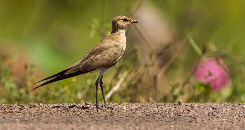 Australian Pratincole is small in size, just like the black bird. It is sandy orange- brown in color with slender and relatively long legs. Its special feature is the pointed narrow black wings. The red on its bill indicates breeding.