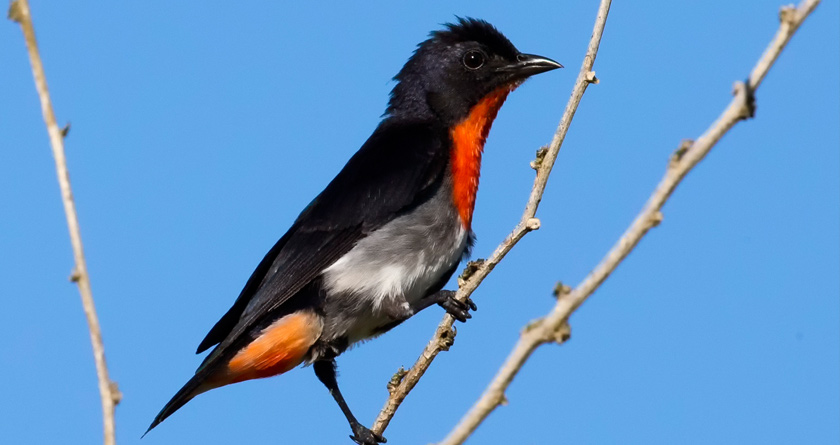 Black-Faced Woodswallow bird is grey in color with a black ‘Zorro’ face mask. Its unique feature is white notches on their tail. It lives in mainland Australia in Queensland, New South Wales and Victoria but it’s not found in south west Australia.